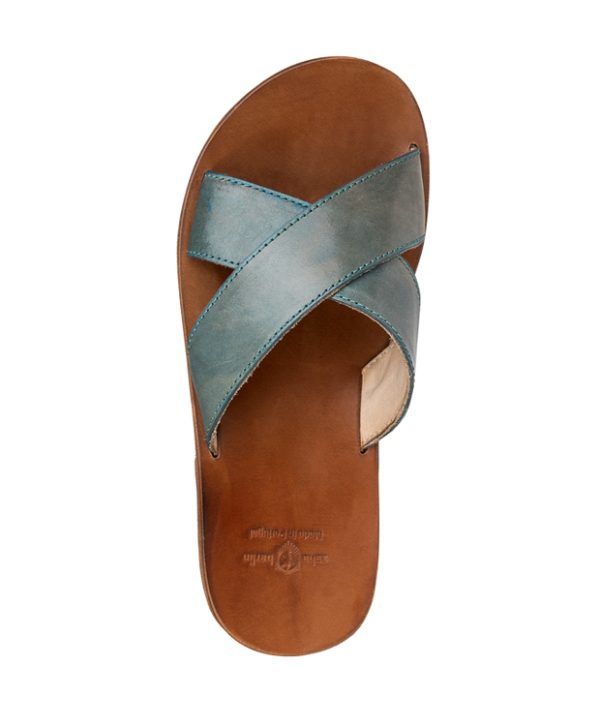 Bei dieser leichten Kalbsleder-Pantolette in angesagtem Hellblau kreuzen sich zwei breite Lederriemen über dem Fußrücken. Das schlichte Design wirkt minimalistisch-elegant und kann sowohl chic als auch lässig kombiniert werden. Die Sandalen sind aus hochwertigem Rindsflankenleder gefertigt, für das Futter wurde weiches Kalbsleder verwendet. Eine Vollledersohle und der gummierte flache Absatz geben dem Fuß einen festen Aufsatz. Die Schuhe kommen in einem praktischen Aufbewahrungsbeutel.