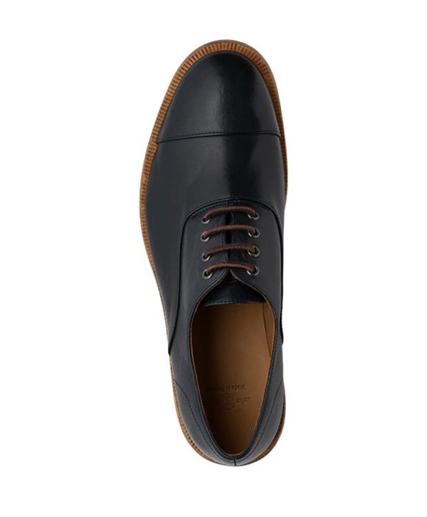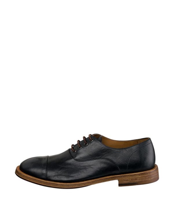 Klassischer Frontkappen – Oxford aus Rindsleder. Die typisch geschlossene 4-Lochschnürung ist mit Lederschnürsenkel versehen. Die feinen Linien der Nähte auf der Frontkappe und an den Seiten, geben dem Schuh ein besonderes Aussehen.