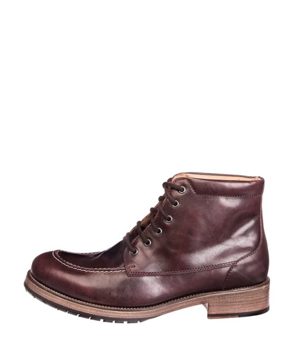 Der robuste Moc-Toe Arbeiterschuh ist in dieser Variante aus Rindsleder, das mit einem speziellen Wachs verdunkelt wurde. Abschließend wurde die Oberfläche unregelmäßig gebürstet, so dass die Originalfarbe teilweise wieder hervorkommt. Durch das Tragen wird der Bordeauxton immer stärker hervortreten.