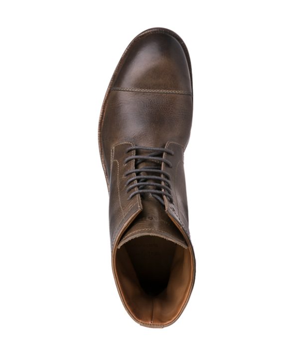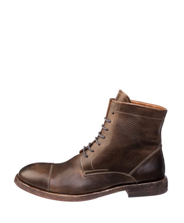 Frontkappen-Stiefelette aus vegetabilem Kalbsleder, das anschließend gewachst und somit eine geschmeidige und doch griffige, seidenmatt glänzende Oberfläche bekommt, die durch das Tragen eine eigene Patina erhält.