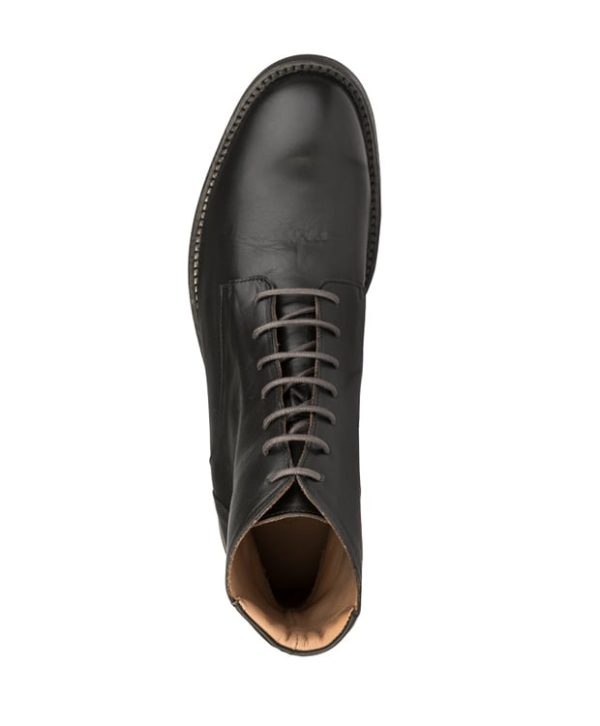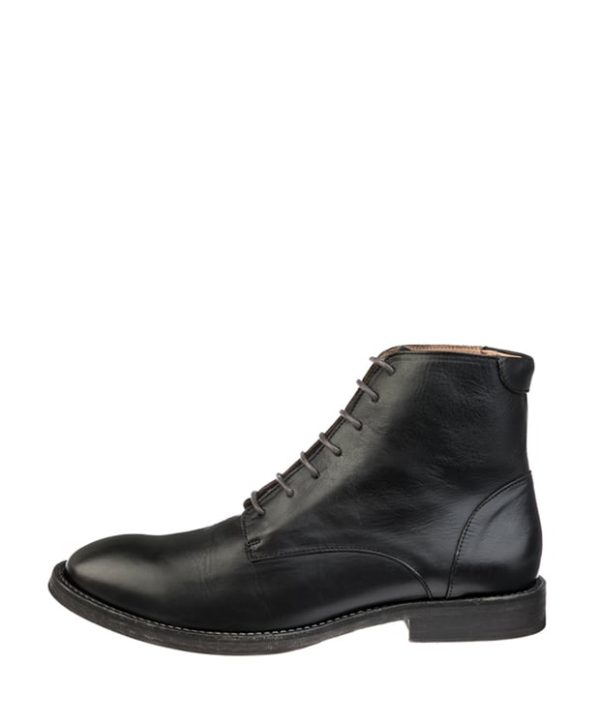 Eine klassische Plain Toe Derby Stiefelette mit flach zulaufender Frontkappe aus vegetabilem Kalbsleder, das geölt und gewachst wurde und somit eine geschmeidige und doch griffige, matt glänzende Oberfläche bekommt, welche durch das Tragen eine eigene Patina erhält. Runde Schnürsenkel schnüren die 7-Lochleiste.